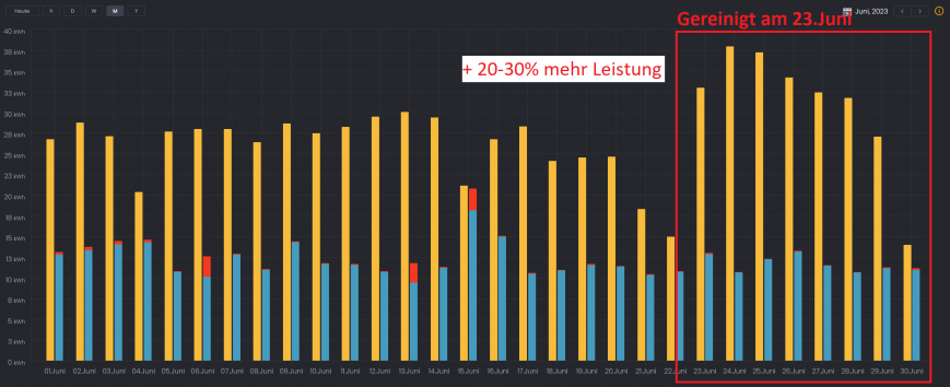 Durch die natürlichen Verschmutzungen wie Regen, Abgase oder Staub setzt sich von Zeit zu Zeit ein immer dickerer Film auf den Panels fest, der die Leistung der Anlage reduziert und somit den Stromertrag mindert.